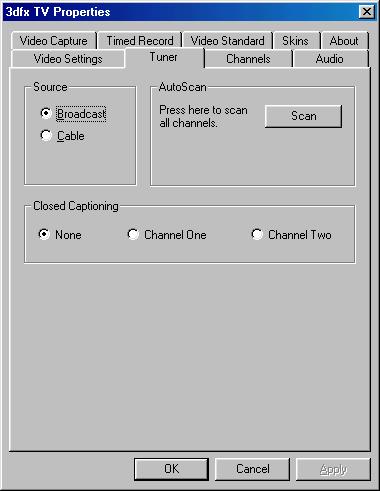 Die Registerseite "Tuner" im Dialogfeld "3dfx TV-Eigenschaften"